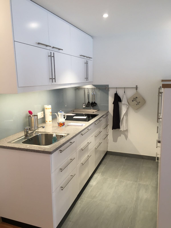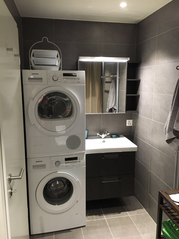 Une belle chambre, une salle de douche avec une colonne de lavage et séchage du linge, un grand living avec cuisine ouverte.
