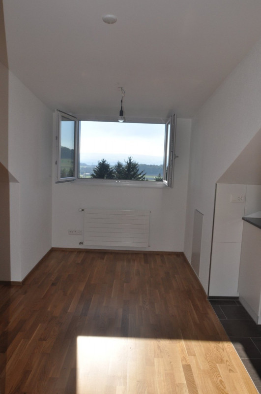 Wohn- und Schlafzimmer mit ParkettbodenKüche und Nasszelle mit dunklem PlattenbodenOffene Küche mit Glaskeramikherd, Backofen, Geschirrspüler und StauraumNasszelle mit WC, Lavabo, Spiegelschrank und DuscheEigenes KellerabteilWaschküche und Trockenraum zur MitbenutzungHaustiere sind erlaubt.