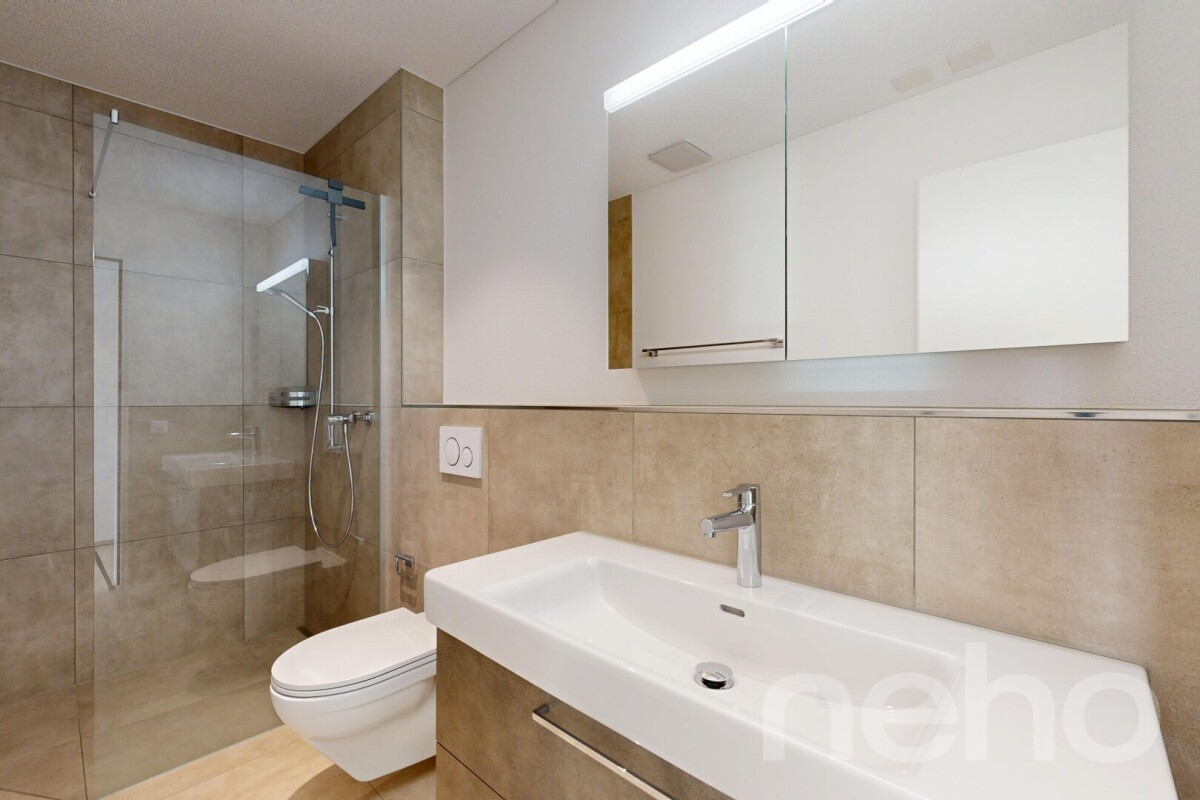 Die Wohnung verfügt über zwei Nasszellen. Das Bad en Suite zum Elternschlafzimmer ist mit WC, Badewanne und Dusche ausgestattet. Eine weitere Nasszelle mit WC und Dusche steht dem übrigen Wohnbereich zur Verfügung. Ein separates Reduit mit Waschbecken und Waschturm sorgt für zusätzliche Funktionalität und Stauraum.