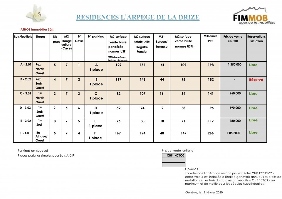 - Lots A, C, D, E, F, Libres - Lot B : Réservé (Situation au 19.02.2020)