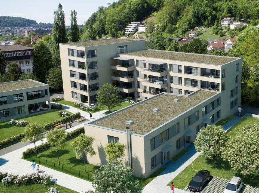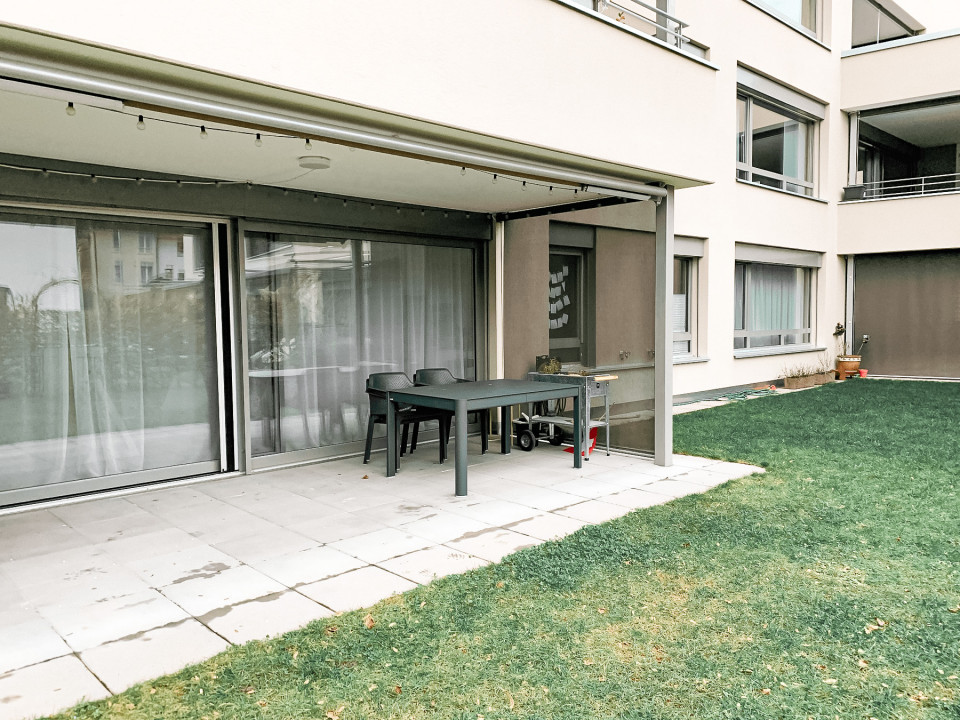 Ausserdem verfügt die Erdgeschoss-Wohnung über einen eigenen Sitzplatz mit Blick auf die wunderschöne, begrünte Parkanlage.