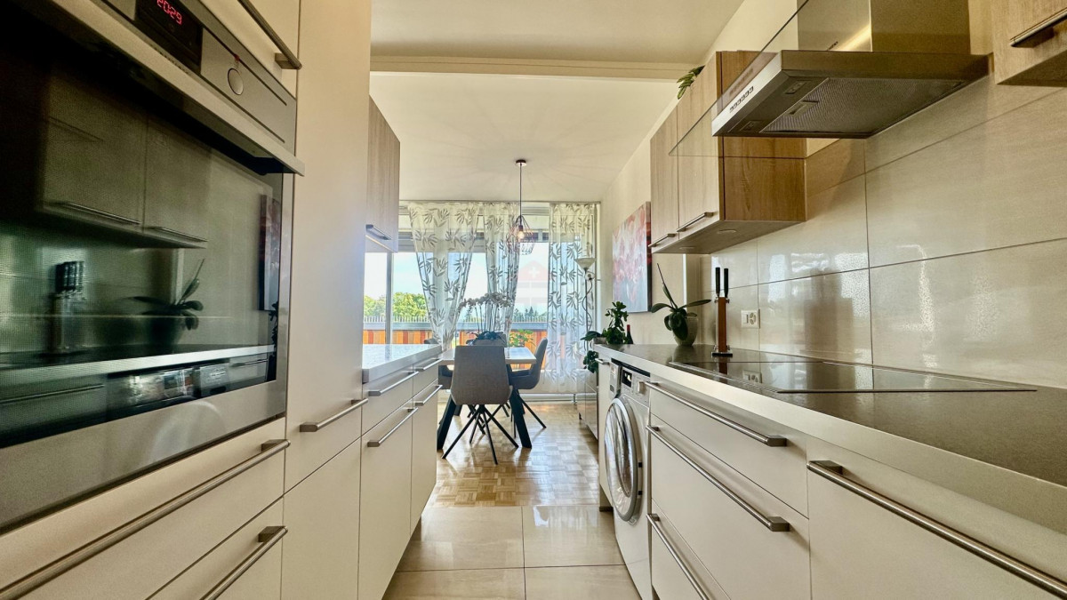 Dès l'entrée, vous serez charmé par le vaste séjour lumineux, prolongé par une cuisine semi-ouverte moderne, idéale pour allier convivialité et praticité. Le séjour bénéficie d'un accès direct à un balcon carrelé de 10 m², parfait pour profiter des couchers de soleil sur la nature environnante.