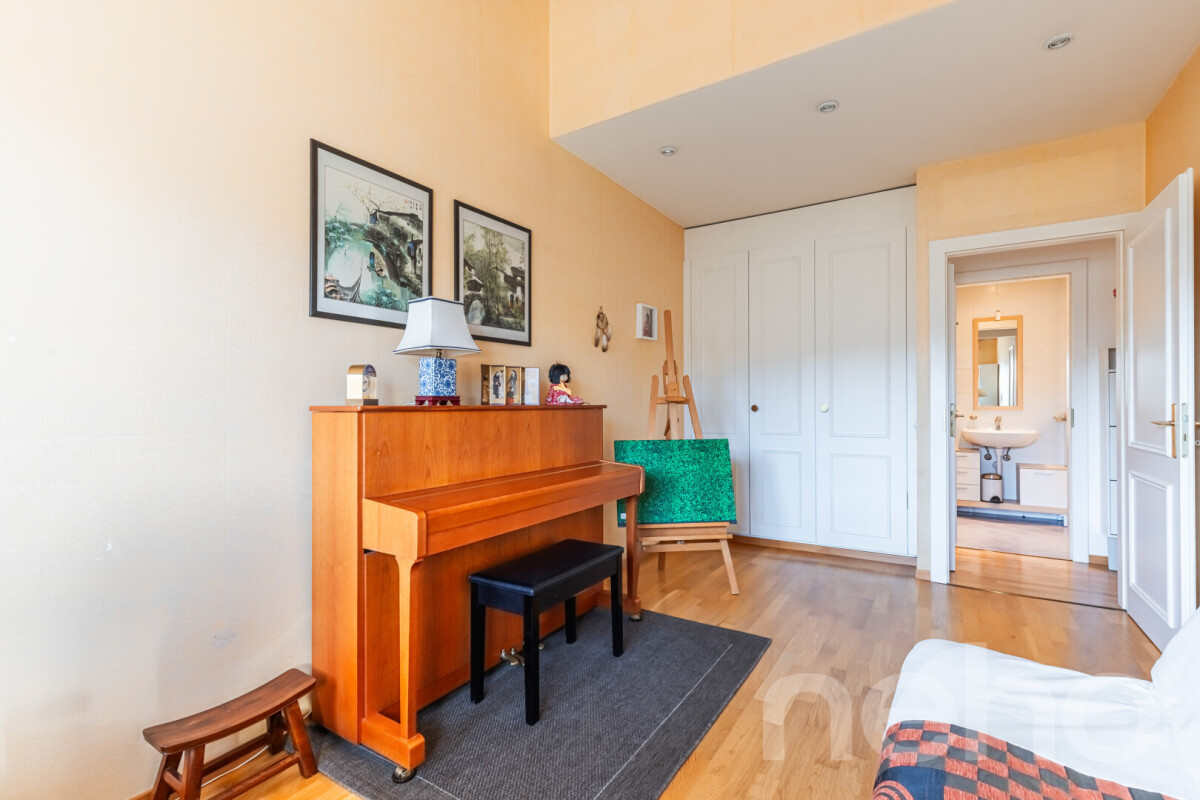Idéalement situé, cet appartement bénéficie d'un emplacement rare : au c?ur d'une résidence prestigieuse, il offre un calme absolu tout en restant à proximité de toutes les commodités. Commerces, transports publics et écoles sont accessibles en quelques minutes, permettant de profiter pleinement d'un cadre de vie tranquille tout en restant connecté à la ville.Ce très grand appartement se distingue par ses volumes généreux, ses finitions soignées et sa luminosité exceptionnelle. Traversant, il bénéficie de belles hauteurs sous plafond et d'une lumière naturelle abondante qui apportent une véritable sensation d'espace et de confort.Le vaste salon-séjour, au c?ur de l'appartement, bénéficie d'une belle cheminée et s'ouvre sur un balcon offrant une vue entièrement dégagée sur la verdure, surplombant le très grand jardin commun de la copropriété, garantissant un environnement calme et agréable.La partie nuit comprend trois chambres spacieuses et lumineuses. Une mezzanine supplémentaire offre un espace polyvalent, idéal pour un bureau, une chambre d'amis ou un espace loisirs, selon vos besoins.Deux boxes fermés en sus (CHF 80'000.- pour les deux ou CHF 40'000.- chacun), avec possibilité d'installer une borne pour voiture électrique, se trouvent à seulement 10 mètres de l'ascenseur. Une très grande cave à côté de l'ascenseur ainsi qu'une cave à vin indépendante complètent ce bien.La résidence propose également des espaces communs très agréables, comprenant un jardin partagé, un potager entretenu par un groupe de copropriétaires, deux grandes buanderies communes, et bénéficie des services de sa propre conciergerie. La copropriété a récemment été équipée de panneaux photovoltaïques.À seulement 100 m, l'on accède au bord de l'Äire, offrant plusieurs kilomètres de promenade sans circulation. Une école primaire et une école maternelle Montessori se trouvent également à proximité immédiate, accessibles à pied sans traverser de route. Un arrêt de bus à 100 m dessert le réseau TPG, facilitant vos déplacements vers le reste de la ville.