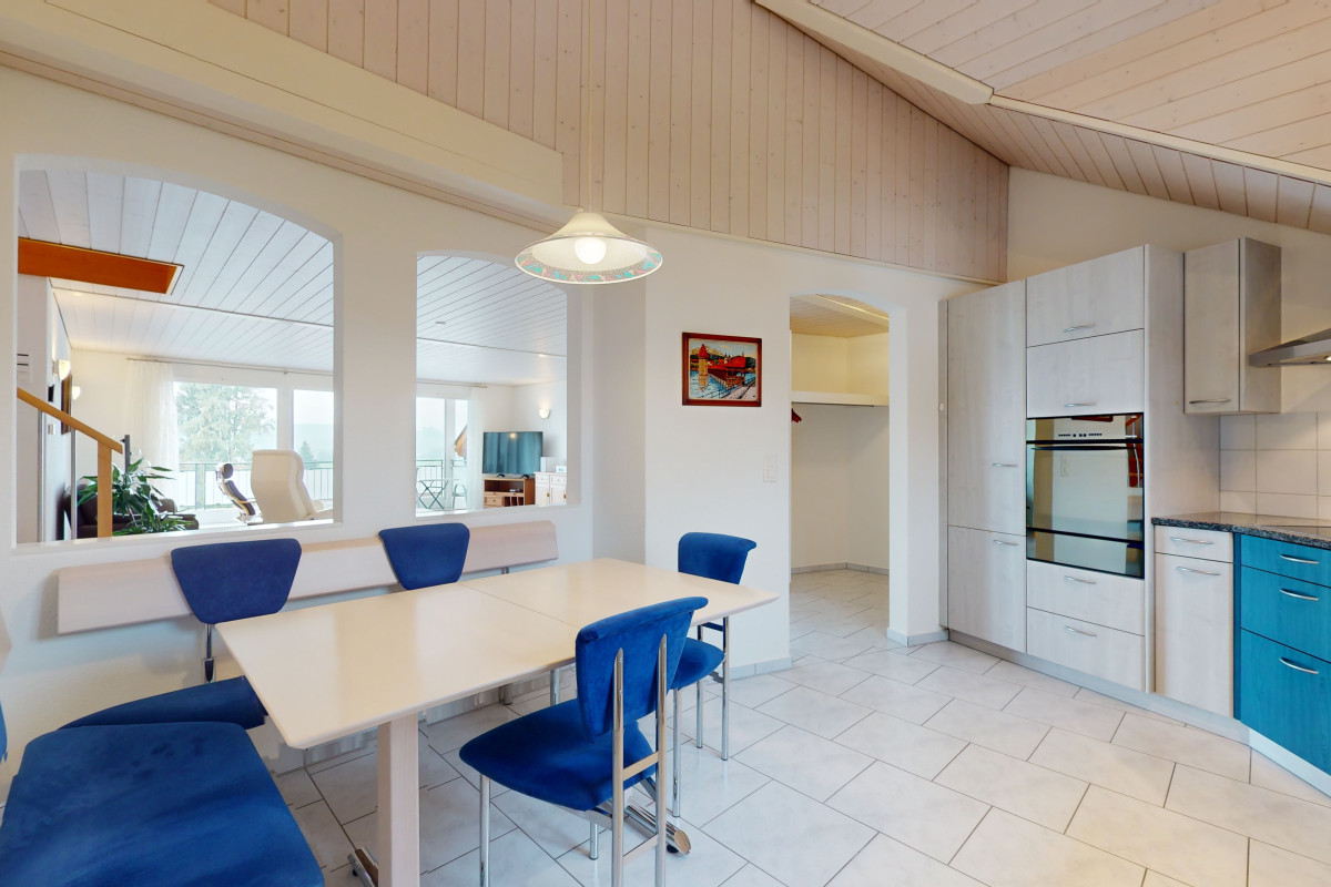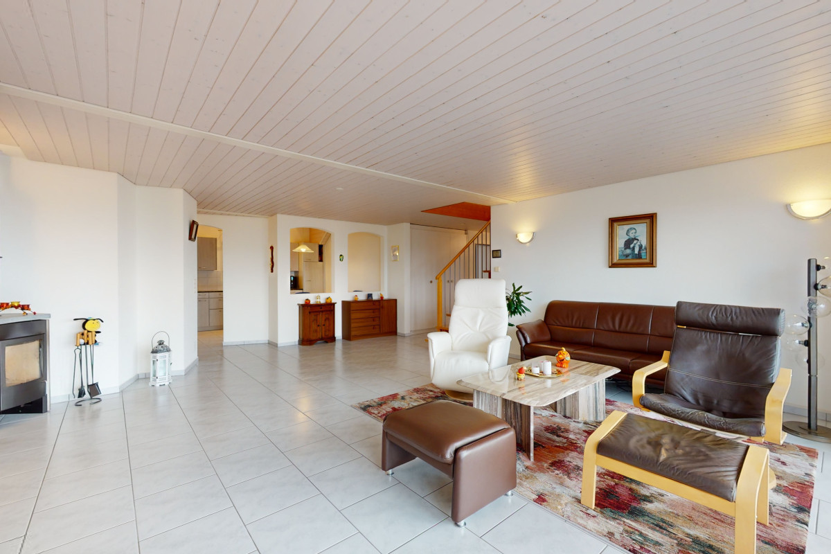 Mit einer grosszügigen Wohnfläche von 195 m², verteilt auf zwei Etagen, beherbergt diese Wohnung insgesamt 6,5 Zimmer, darunter vier geräumige Schlafzimmer und zwei moderne Badezimmer, eigener Waschmaschine und einen Balkon auf jeder Etage. Die ungestörte und unverbaute Aussicht sorgt für eine ruhige Atmosphäre, ideal für Familien, die das Leben in vollen Zügen geniessen möchten.