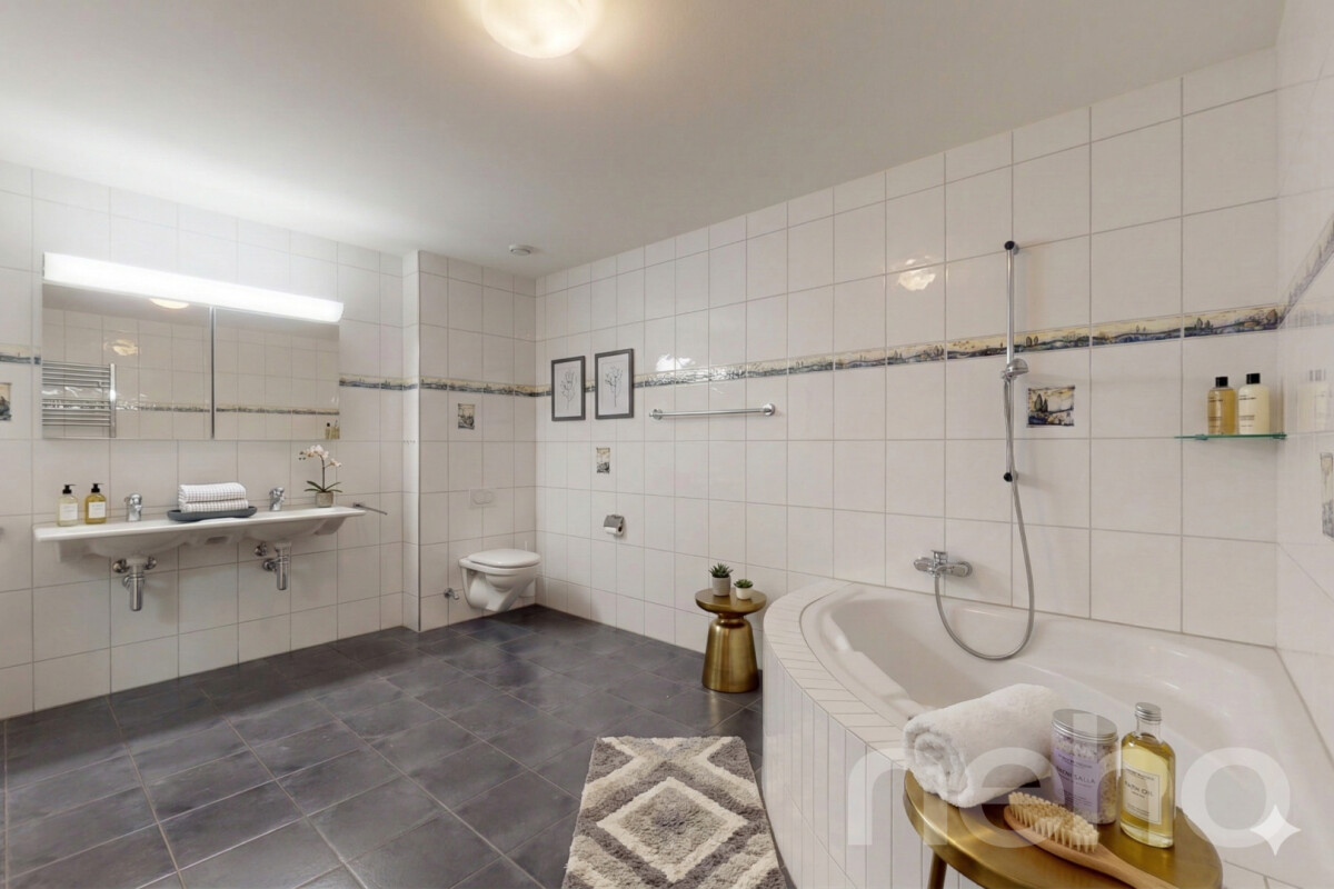 Der lichtdurchflutete Wohn-/Essbereich geht nahtlos in eine Küche mit überdurchschnittlichem Stauraum über. Die Ausstattung der beiden Nasszellen mit Eckbadewanne und Dusche sowie die 30 m² grosse Terrasse garantieren höchste Lebensqualität. Technisch überzeugt das Objekt durch eine nachhaltige Erdsondenheizung und einen erstklassigen Ausbaustandard mit Minergie-Zertifizierung.