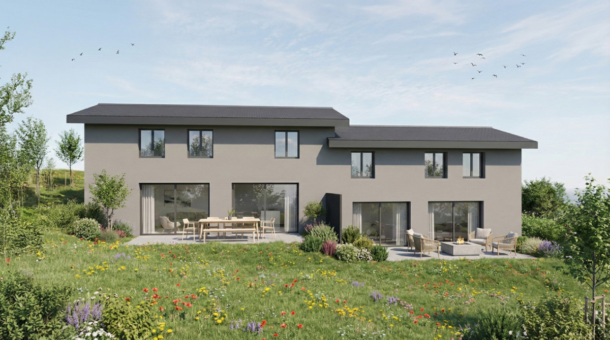 This 4.5-room semi-detached house project, scheduled for construction in 2026, offers a modern, comfortable living environment perfectly suited for family life. The design emphasizes generous volumes and abundant natural light, featuring a spacious open-plan living area seamlessly connected to a fully equipped modern kitchen, creating a welcoming and functional living space.