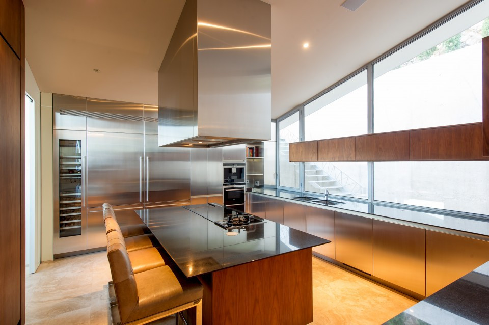The designer kitchen fuses style with the highest-level ease of use thanks to its superior quality appliances by Gaggenau.