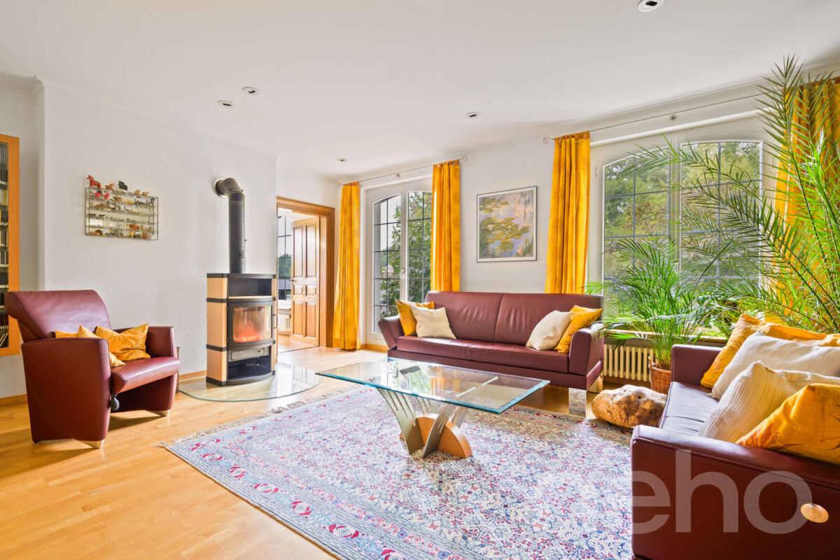 Dieses aussergewöhnliche 12-Zimmer-Haus überzeugt mit einer Nettowohnfläche von 355 m² plus 190 m2 weitere Innenflächen auf vier Etagen und vereint Grosszügigkeit mit stilvollem Charme. Die Liegenschaft aus dem Jahr 1948 befindet sich in gepflegtem Zustand und besticht durch helle Räume, Weitblick, sowie vielseitige Nutzungsmöglichkeiten. In einem ruhigen, familienfreundlichen Quartier gelegen - und dennoch zentral - bietet das Haus viel Lebensqualität. Auf dem 1'200 m² grossen Grundstück erwartet Sie ein liebevoll angelegter Garten mit Teich, Jacuzzi, Gartenhaus sowie zusätzlicher Fläche von ca. 216 m2, welche zur ausschliesslichen Nutzung zur Verfügung steht. Die 48 m² grosse Terrasse lädt zum Verweilen ein. Ein 21 m² umfassender Wintergarten mit Cheminée schafft eine besondere Atmosphäre für gemütliche Stunden. Der separate Waschraum mit eigenem Eingang, die Garage mit elektrischem Tor unterstreichen die Funktionalität. Im ausgebauten Keller bietet sich Raum für ein stilles Gewerbe, Atelier oder Büro oder Ähnliches. Eine seltene Gelegenheit für alle, die viel Platz und ein stilvolles Zuhause mit vielen Möglichkeiten suchen. Auf Wunsch können 802 m2 angrenzendes Land mit Nutzungsreserve zusätzlich erworben werden (optional).