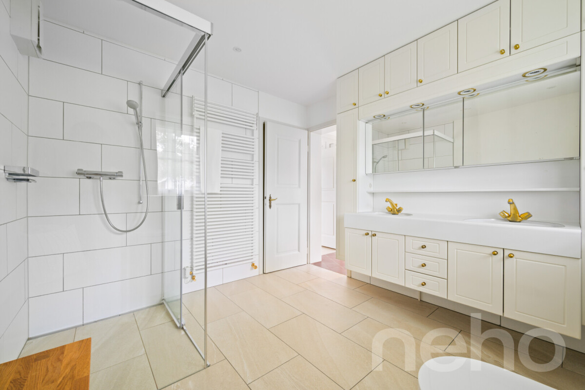 This exceptional 12-room house offers a net living space of 355 m², plus an additional 190 m² of interior space spread over four floors. It combines generous dimensions with timeless charm. Built in 1948, the property is in well-maintained condition and stands out with its bright rooms, open views, and versatile layout. Located in a quiet, family-friendly neighborhood - yet still centrally situated - it offers a high quality of life. Set on a 1,200 m² plot, the home features a beautifully landscaped garden with a pond, jacuzzi, garden house, and approximately 216 m² of additional space for exclusive use. A 48 m² terrace invites you to relax, while a 21 m² winter gard...