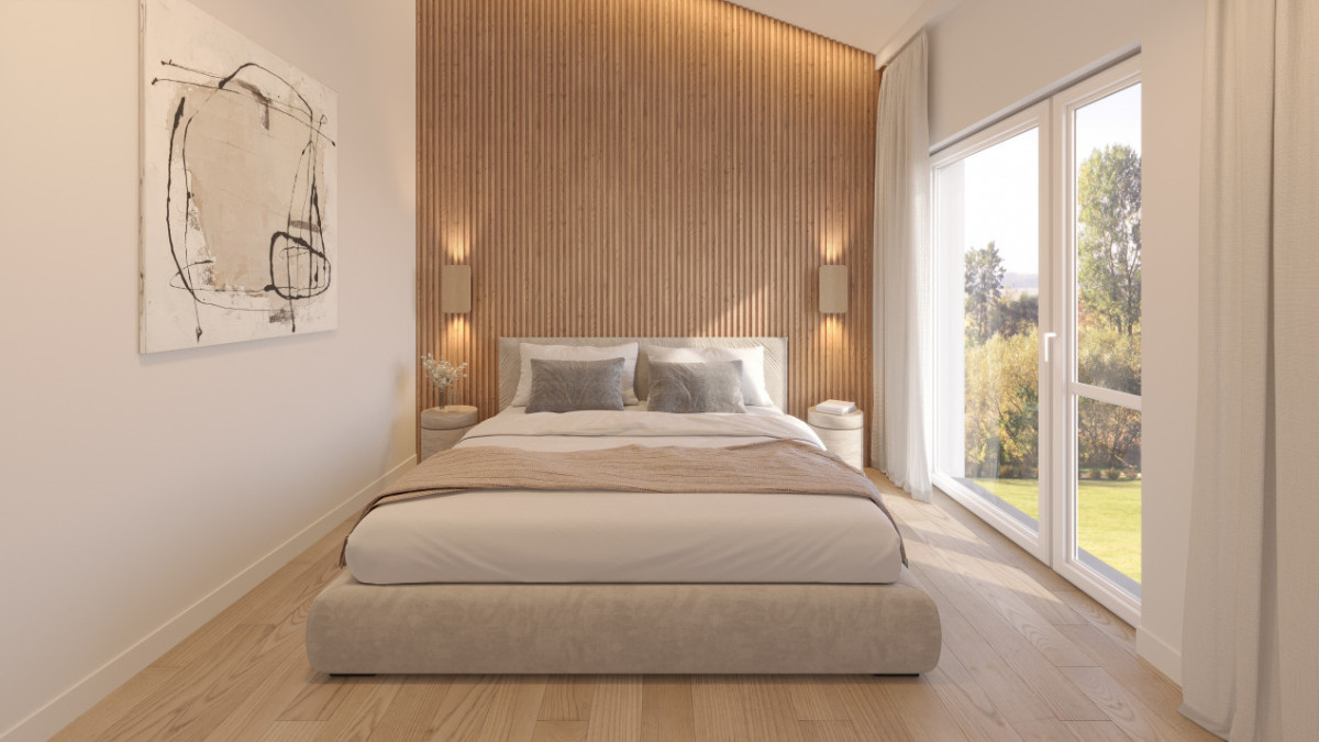 Deux places de parking couvertes complètent chaque villa, avec en option : piscine privée ou salon d’extérieur.