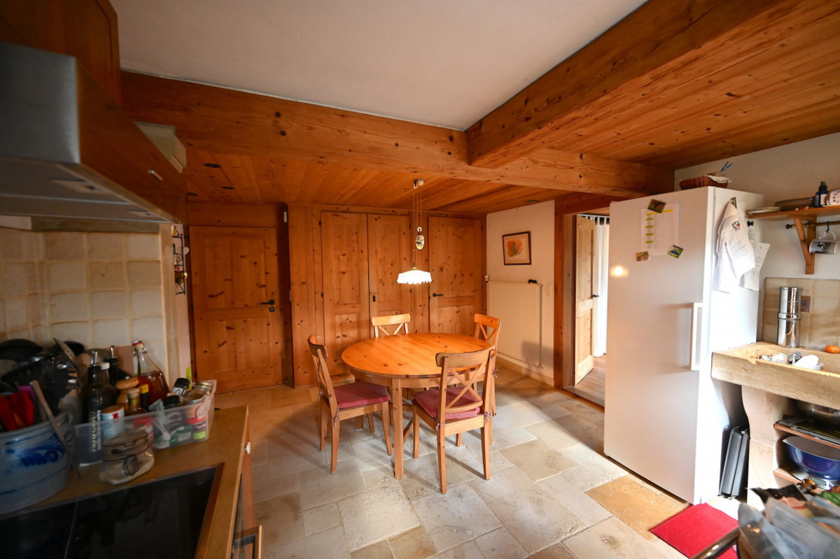 Le corps de ferme comporte une grange avec de très grands volumes offrant beaucoup de possibilités d'aménagement ainsi que divers locaux dont un carnotzet avec four à pain, un garage avec chambre froide, un atelier, une écurie pour poneys ainsi qu'une stabulation libre actuellement utilisée pour la transformation du cidre.