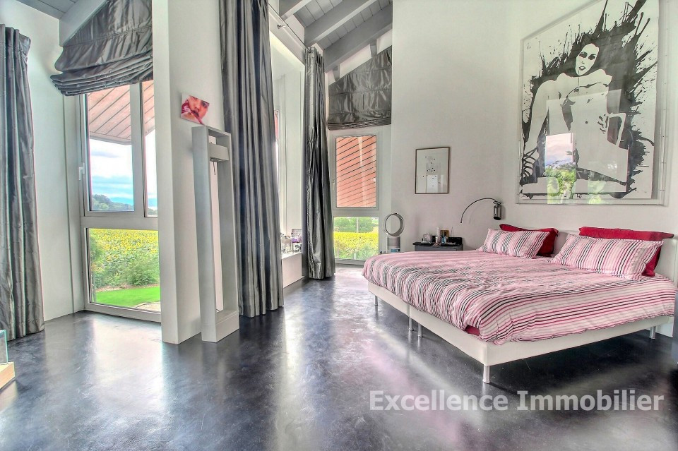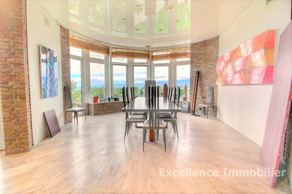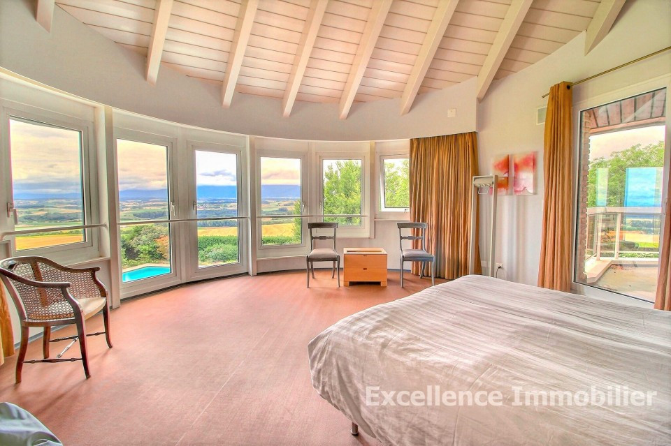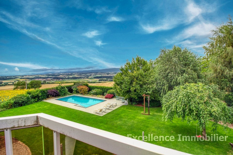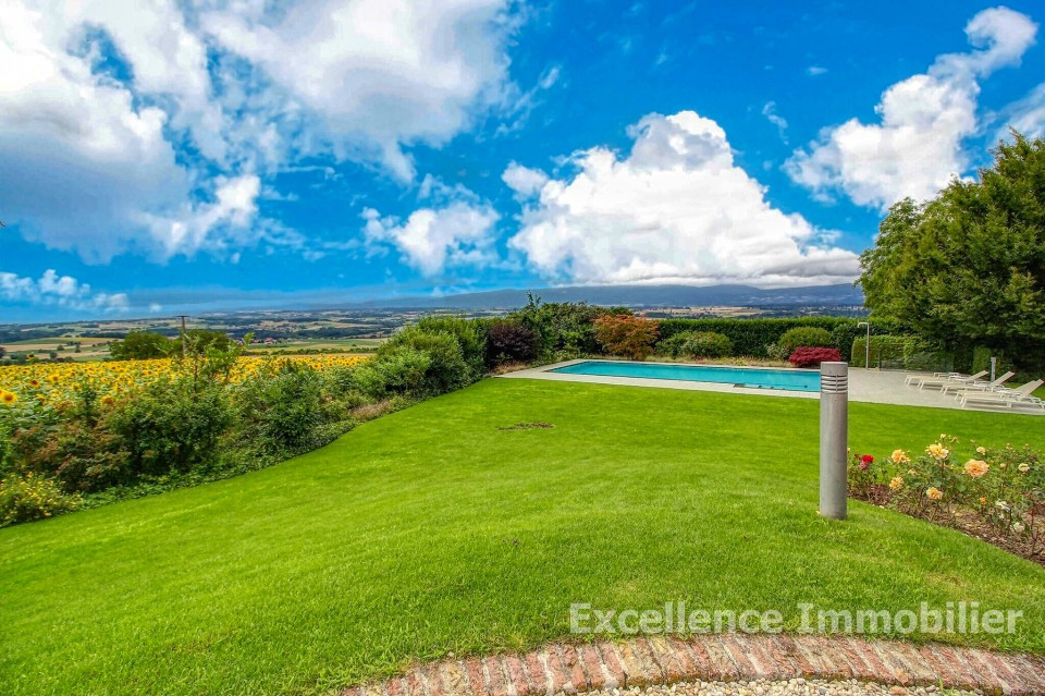 Elle est nichée dans un écrin de verdure et offre une vue splendide et spectaculaire sur la plaine ainsi qu’une échappée sur le lac.