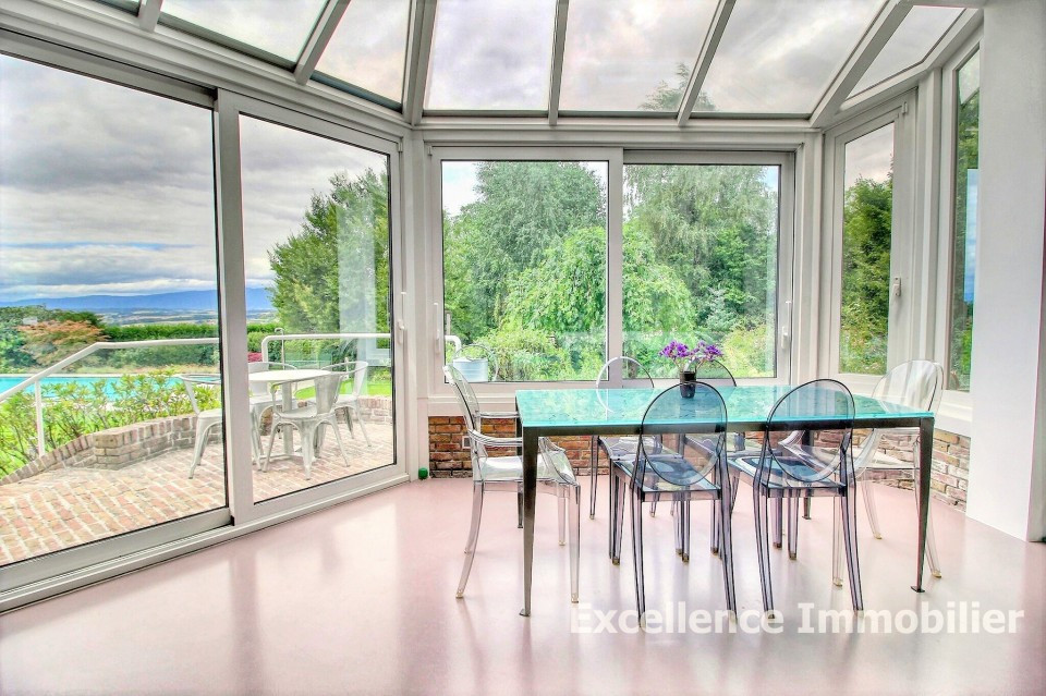 1 salle à manger avec baies vitrées et vue sur la nature