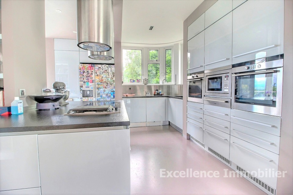 1 spacieuse cuisine luxueuse avec des matériaux hauts de gamme et un bel espace à manger ainsi qu’un accès sur une terrasse et le jardin
