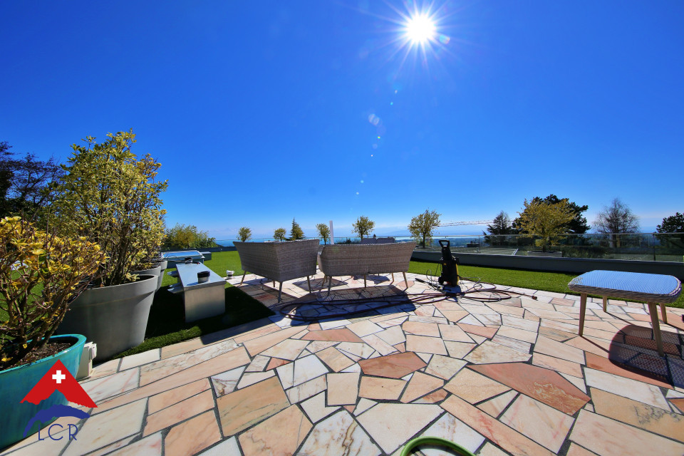 Sur le toit, grande terrasse commune avec vue panoramique sur le lac & les Alpes.