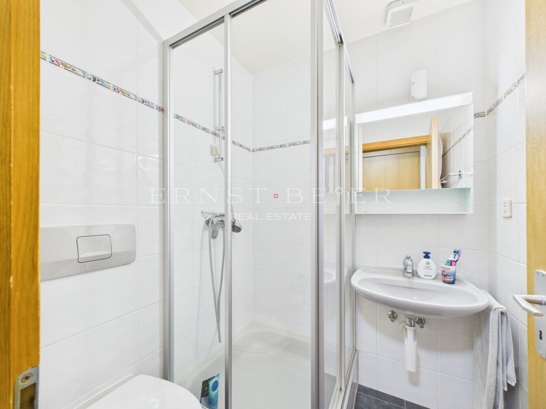 Dès l'entrée, un petit hall avec armoires murales dessert une salle d'eau avec douche/WC et permet d'accéder dans la pièce à vivre.