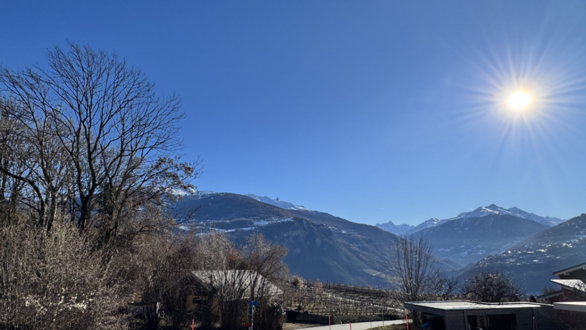 Emplacement stratégique à moins de 10 minutes de Sion avec une vue sur les montagnes et le vignoble.