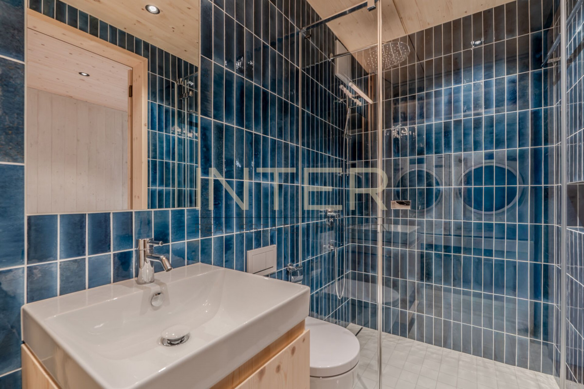 Direkt beim Eingangsbereich befinden sich ein Gäste-WC mit Dusche sowie ein eingebauter Waschturm. Eines der Schlafzimmer verfügt über ein Bad en suite mit Badewanne. Die Schlafzimmer sind von der Hauptstrasse abgewandt und bieten dadurch einen ruhigeren Rückzugsbereich.