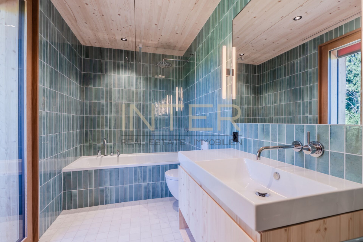 Die natürliche Materialisierung mit hochwertigem Holzausbau, geöltem Eichenparkett, Holzfenstern mit 3-fach-Verglasung und eichenfurnierten Türen schafft eine warme und stilvolle Wohnatmosphäre. Die moderne Küche mit Kochinsel, Natursteinabdeckung und hochwertigen Geräten unterstreicht den gehobenen Ausbaustandard.