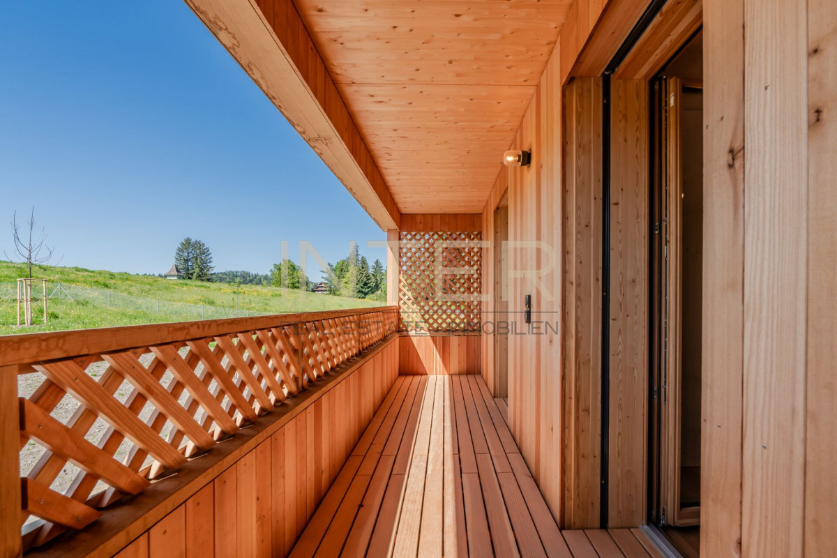 Hochwertiger Erstbezug mit 78,5 m² Wohnfläche, Holzausbau, Cheminée, zwei Badezimmern, drei grosszügigen Loggien, Waschturm, Kellerabteil, Fahrradabstellplätzen und gedecktem Carport.