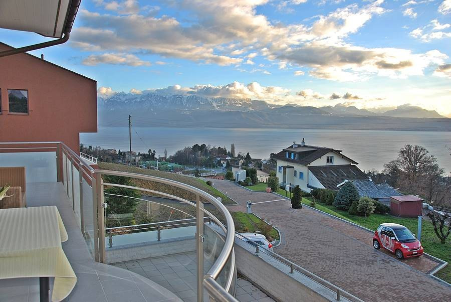 1 grande terrasse (20 m²) offrant une vue dominante et dégagée sur le bassin lémanique et les Alpes,