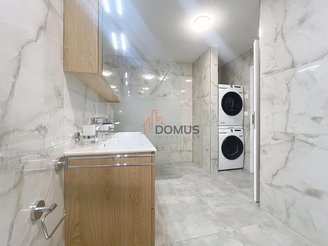 Salle de bain moderne avec douche à l'italienne, baignoire et colonne de lavage intégrée. Cave privative incluse. Accès de plain-pied, finitions soignées.