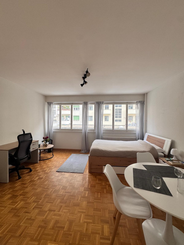 Studio meublé n°14 (21 m2) Situé rue de Zürich 45 à Genève au 4ème étage. Il comprend : Une cuisine équipée (four + 2 plaques électriques) Un lit pour 2 personnes (140 x 200) Une salle de bains avec WC et baignoire. Une concierge et une buanderie commune. Entrée de l'immeuble par digicode. Ce studio est situé proche de la gare Cornavin et des Nations Unies. Loyer 1'590 chf...