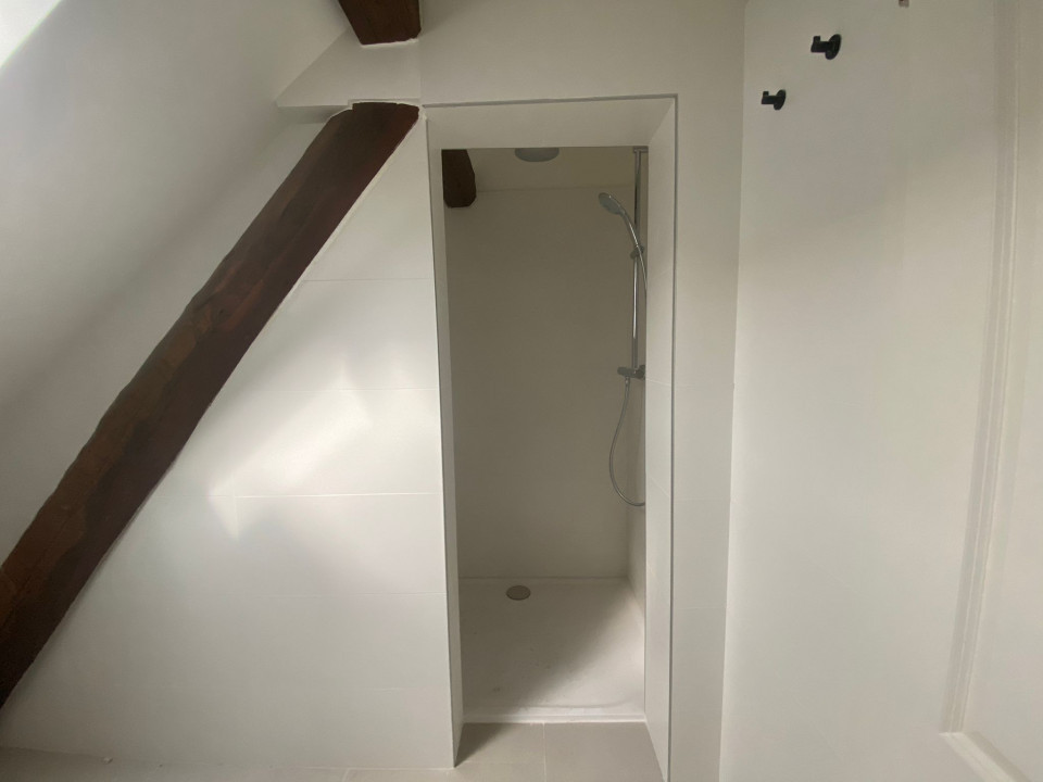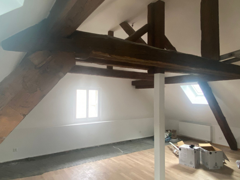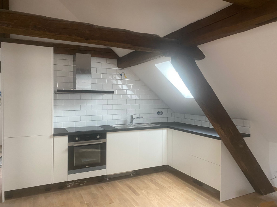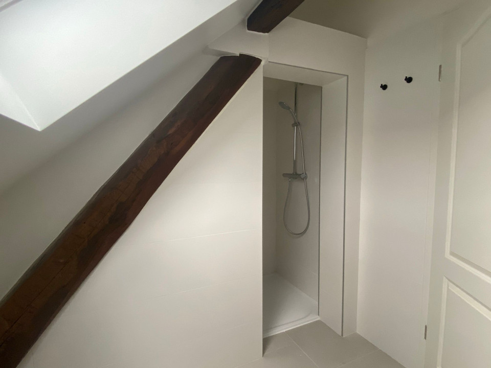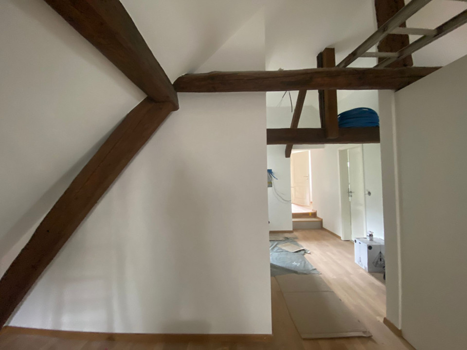 Magnifique appartement en attique mais avec de belles hauteurs, refait a neuf poutres apparentes , 1 WC séparé, 1 salle de bain, 1 très grande pièces et 2 chambres à coucher, un bureau ouvert, calme petit immeuble de 2 appartements, cave et buanderie gratuite, proche centre