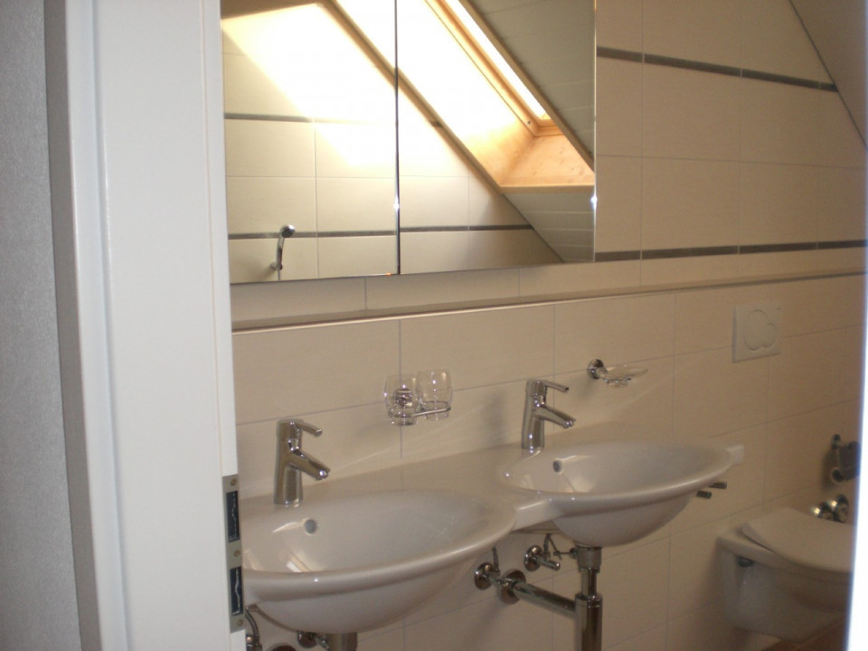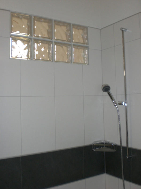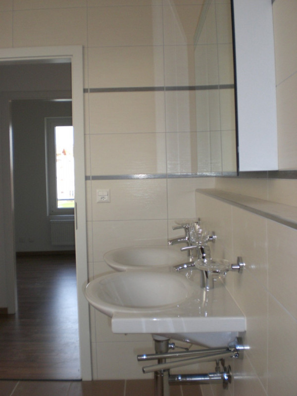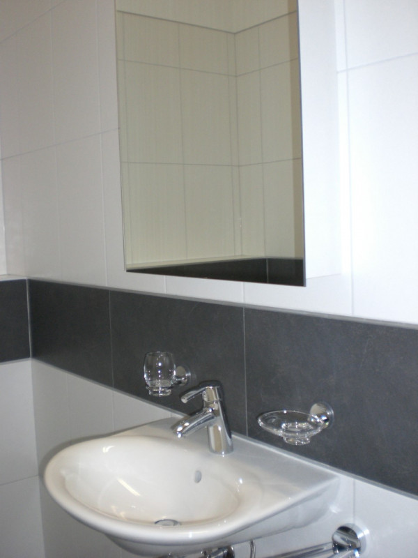 La salle de bain est équipée pour recevoir une tour de machine à laver et sécher le linge.