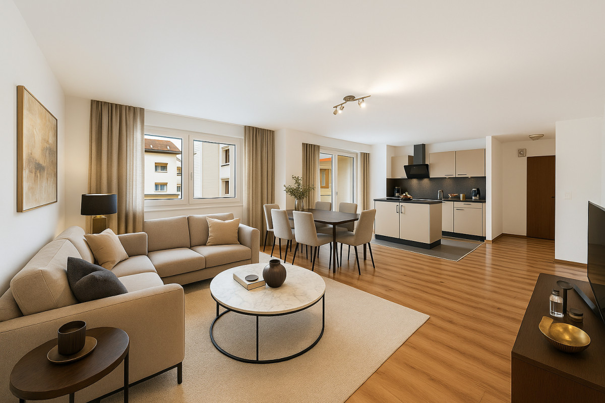 Ce 4,5 pièces offre un cadre luxueux grâce à son marbre intégral, conférant un style noble et intemporel. Le grand séjour ouvert permet de profiter pleinement de la luminosité naturelle, tandis que les trois chambres apportent calme et confort. Deux salles d’eau très élégantes complètent le tout. CHF 1’350 + 190 charges. *Offre valable pour tout bail signé d’une durée...