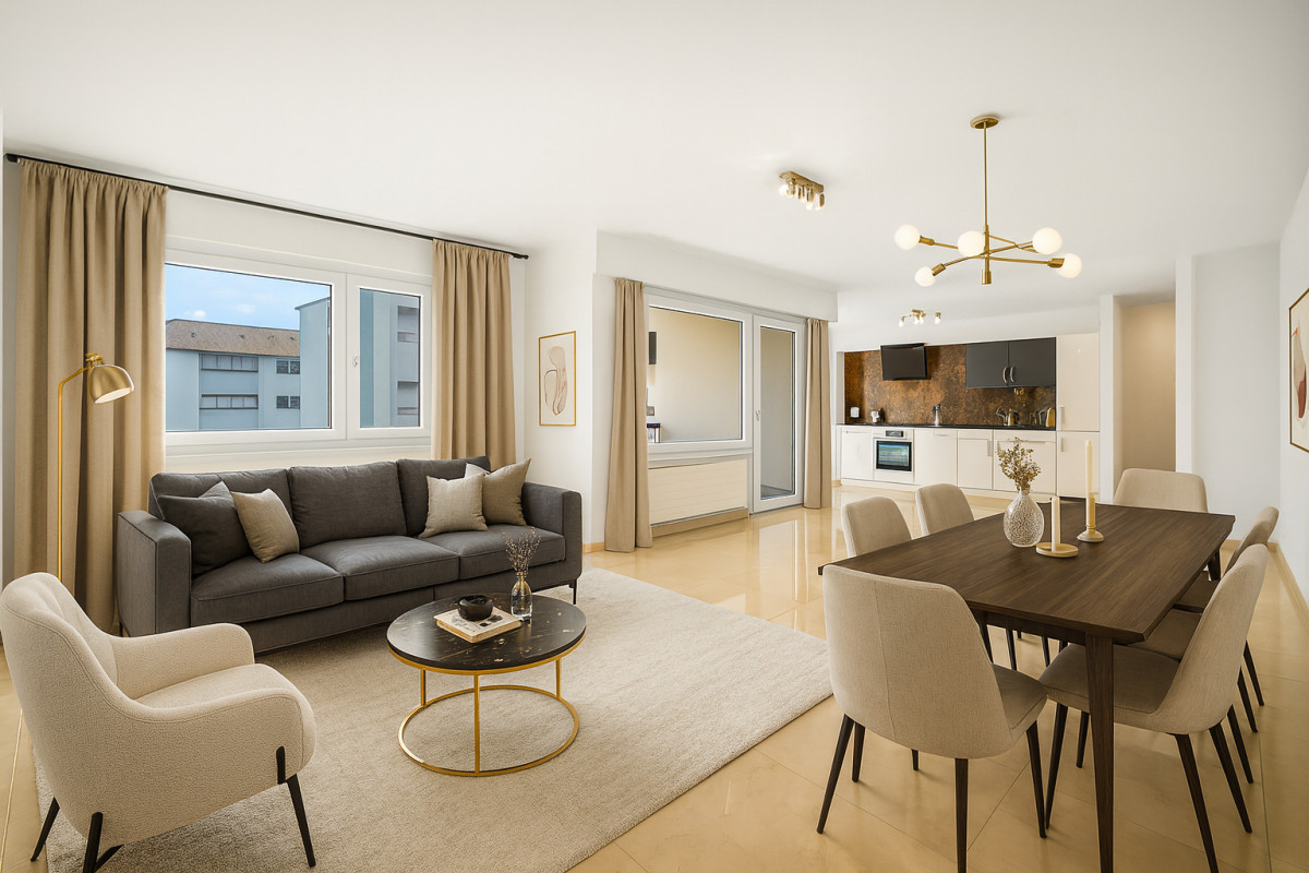 Le vaste salon ouvert sur la cuisine et la terrasse offre un espace de vie exceptionnel,