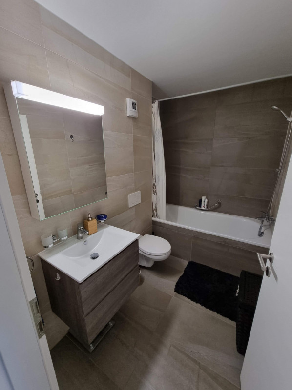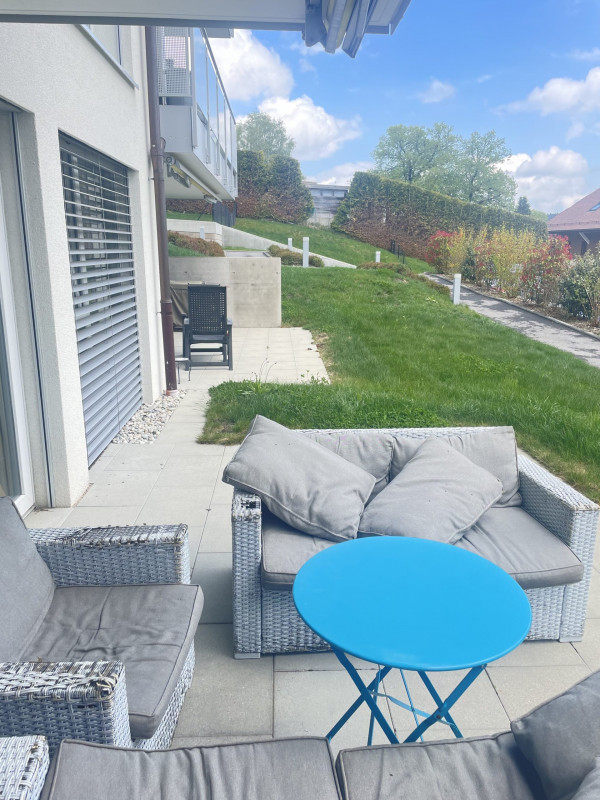 Cet appartement dans un immeuble minergie d’une superficie de 90m2 avec une terrasse de 30 m2 situé en réz de jardin se compose comme suit: