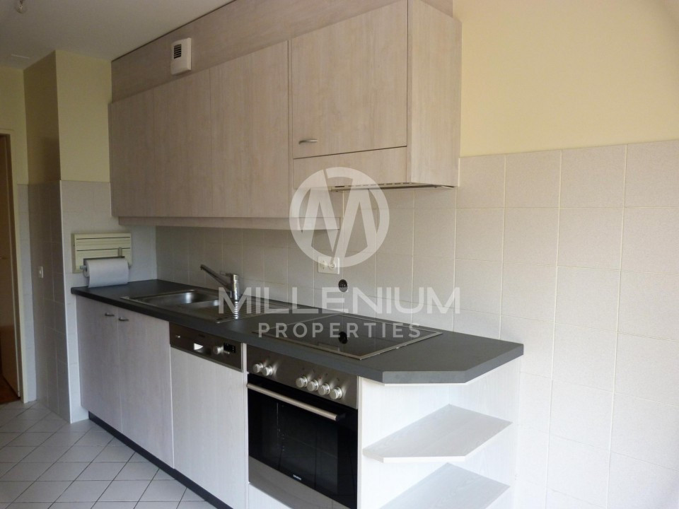 Hall d'entrée avec placards, un grand salon, une chambre avec placards, une belle salle de bain avec WC et une cuisine entièrement équipée.