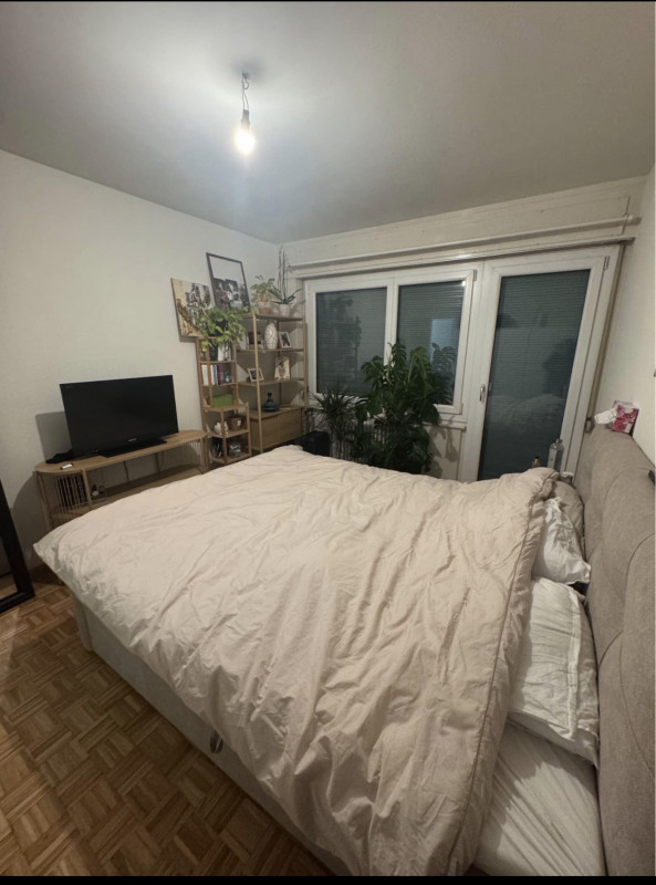 Appartement lumineux de 5 pièces au Grand-Lancy avec balcon, traversant, 105 mètres carré 3 chambres 1 salle de bain 1 WC séparé grand salon salle à manger cuisine fermée Reprise de bail au 16 janvier 2026 Loyer à 2949 charges comprises Frais d'agence à prévoir en cas d'attribution