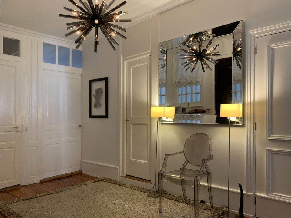 Double salon en enfilade de 55 m2 avec cheminée, doubles portes et soie aux murs.