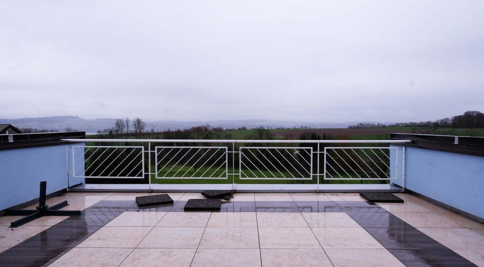 Zone rurale au calme. Grande terrasse d'environ 20m² avec vue sur lac et montagnes.