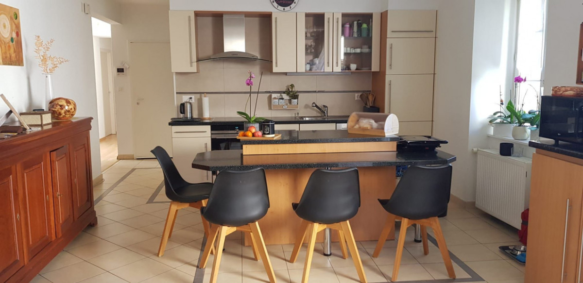 La cuisine ouverte, entièrement équipée, dispose de nombreux rangements et s’intègre parfaitement à la salle à manger. Cet espace de vie, baigné de lumière naturelle, donne accès à une grande terrasse d’environ 60 m², idéale pour les repas en extérieur et les moments de détente.