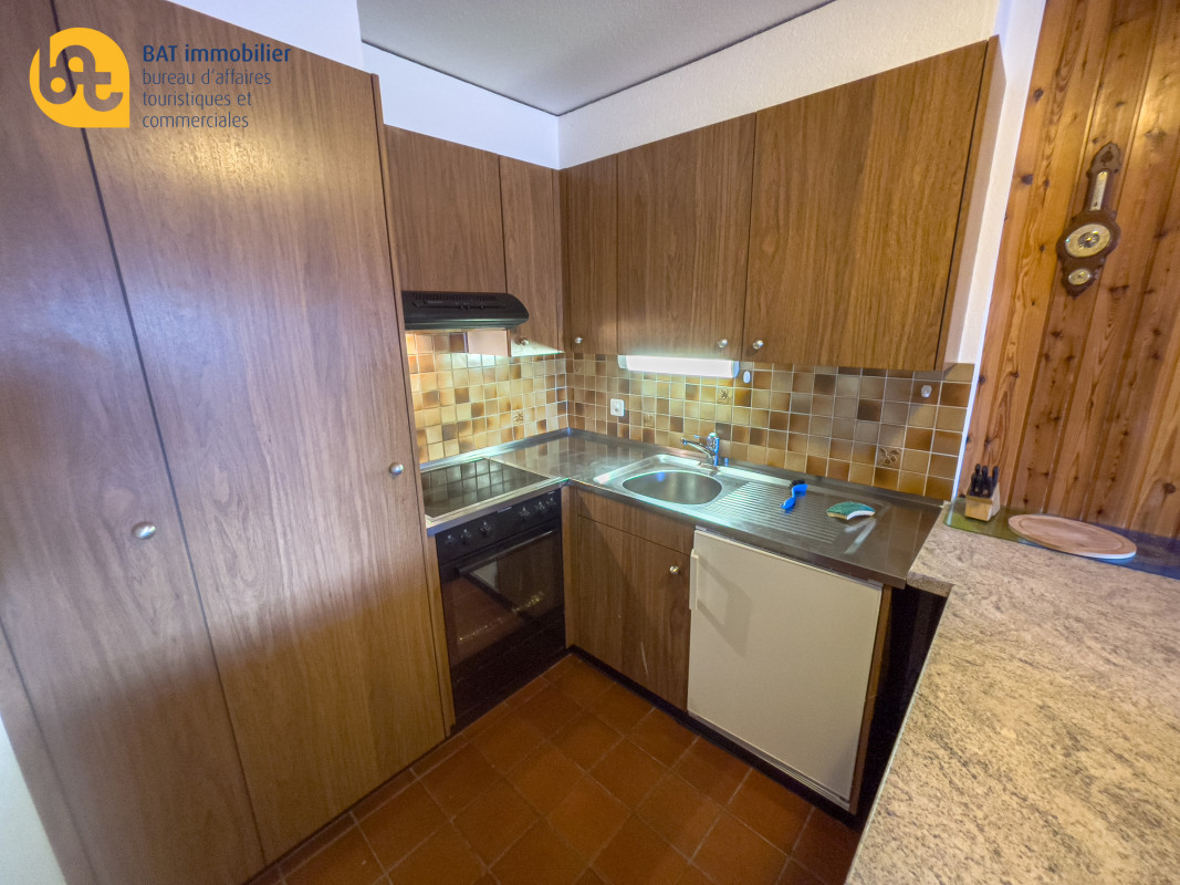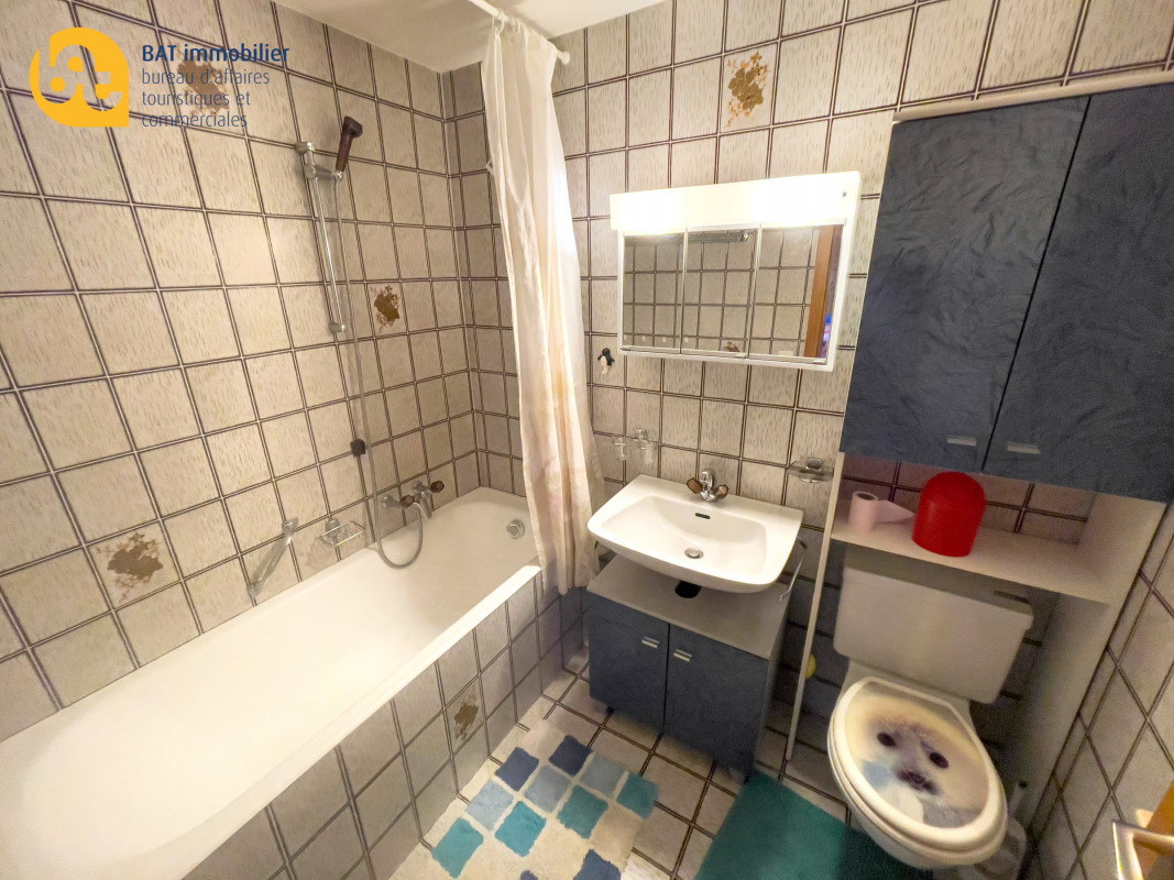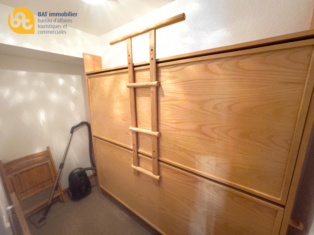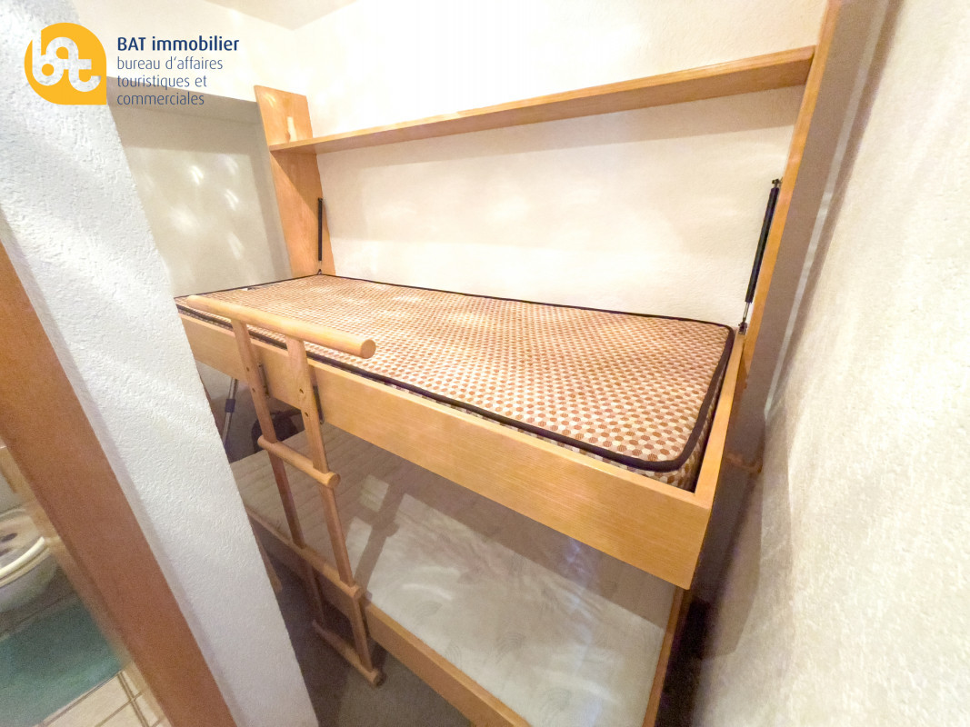 Hall d'entrée, cuisine ouvert entièrement équipée. Séjour avec 2 lits simples côte-à-côte. Coin à manger et accès sur la terrasse. Coin couchage supplémentaire avec armoire-lit escamotable superposé. Salle-de-bain avec baignoire et WC.
