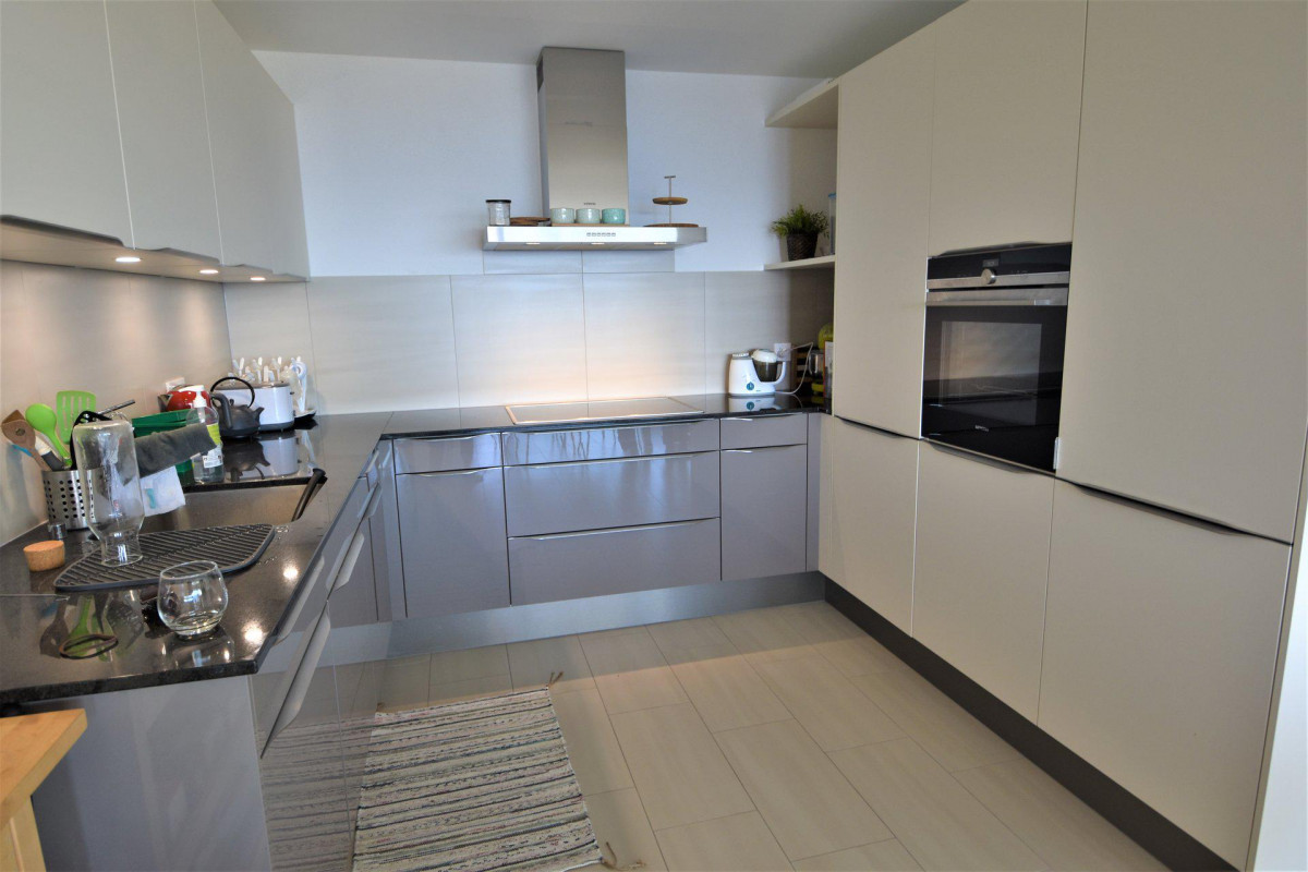 Le coeur de l'appartement est le grand espace de vie : le salon et la salle à manger s'ouvrent sur la cuisine contemporaine et offrent un accès direct à une splendide terrasse de 20 m². La cuisine est équipée d'appareils haut de gamme, d'un plan de travail en pierre et de nombreux rangements fonctionnels.