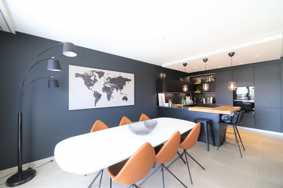 Une cuisine parfaitement équipée ouverte sur la salle à manger et le salon.