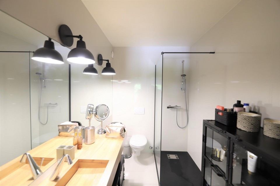 Le coin nuit est composé d'une suite parentale avec salle de bain, douche et toilettes, une chambre et une salle de douche. Les deux chambres accèdent directement à la terrasse arrière.