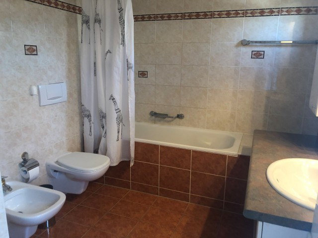 - 1 salle de bain avec baignoire, WC et grande fenêtre