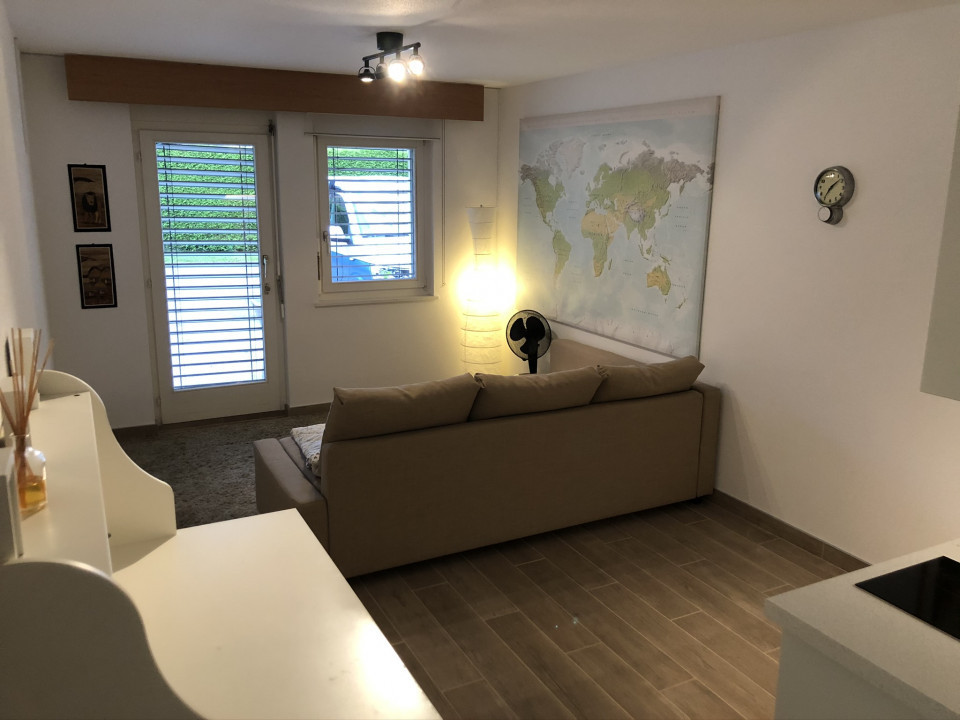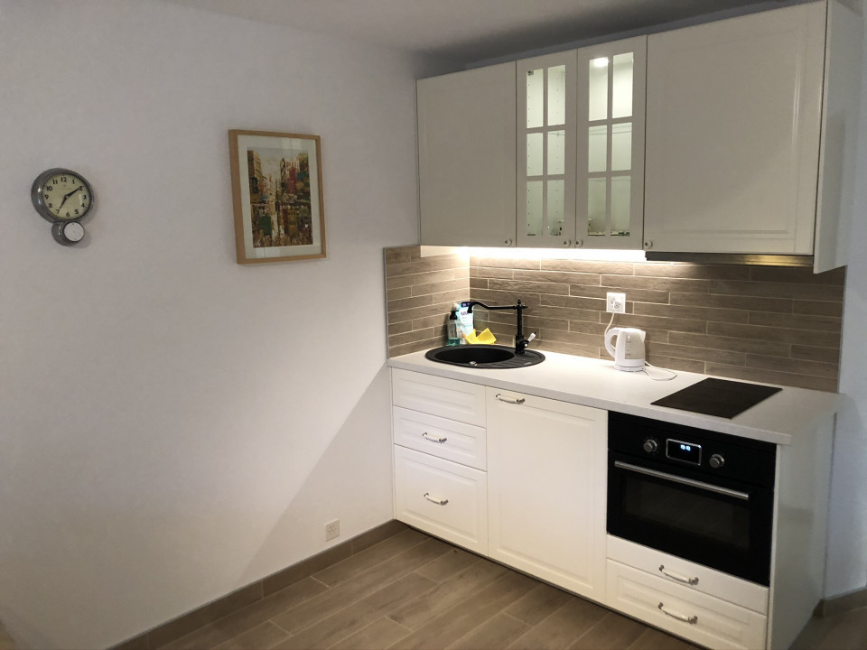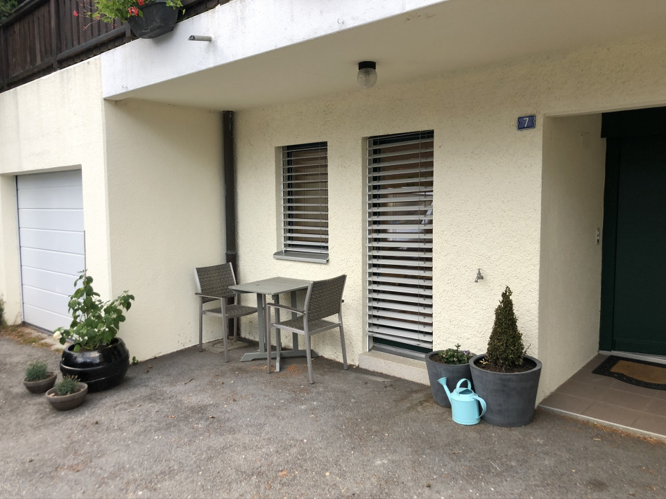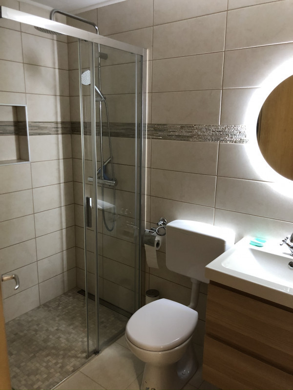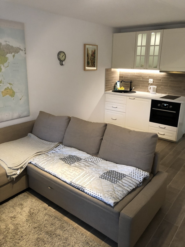 Il y a un grand salon / chambre avec une cuisine agencée et une salle de douche / toilette séparée. Tout est récemment renouvelé est dans un très bon état. Terrace devant l’entrée.