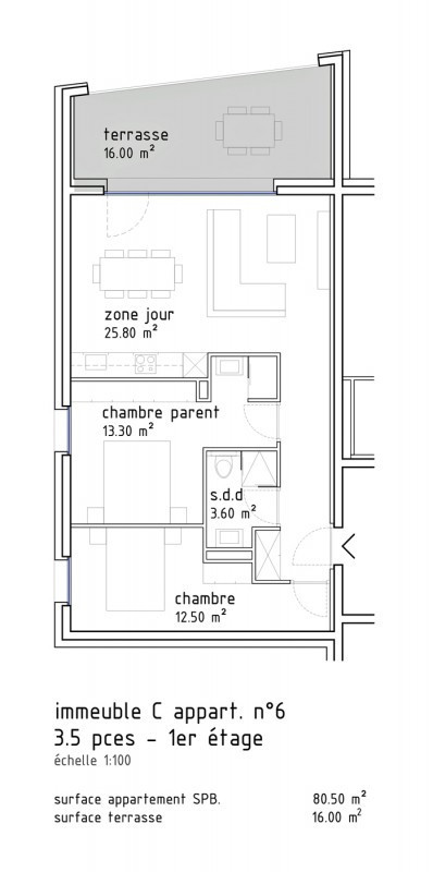 Cet appartement est composé d'un hall d'entrée avec armoire murale, une cuisine ouverte sur la pièce à vivre donnant accès à la terrasse, deux chambres à coucher et une salle de douche/WC.