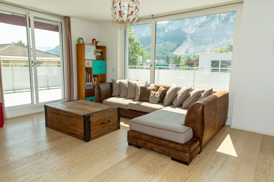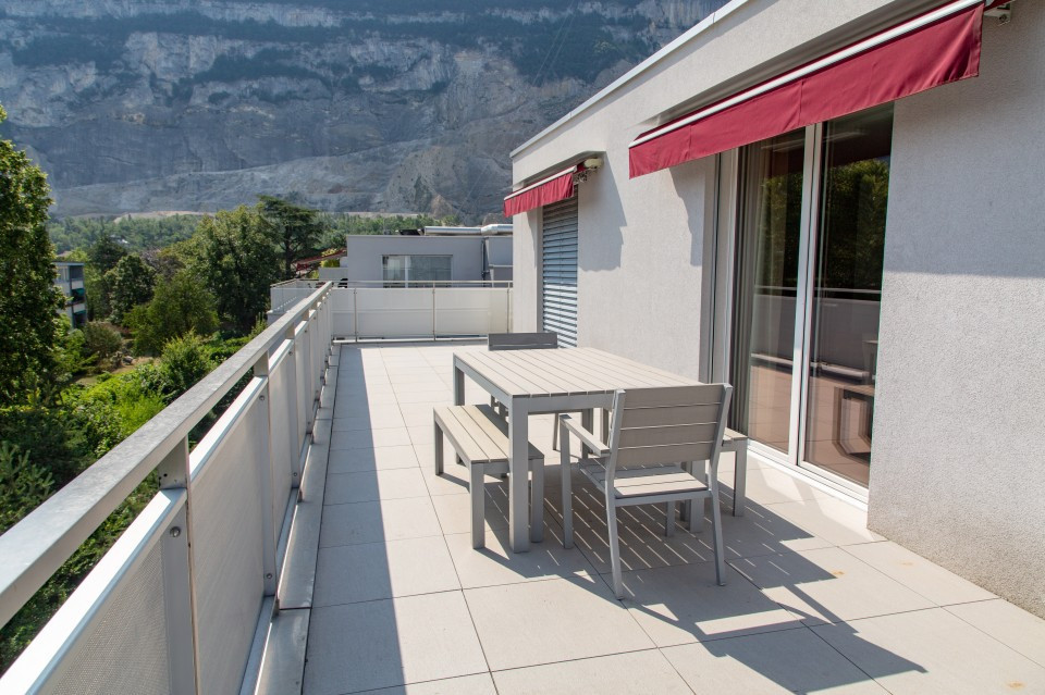 Terrasse de 75 m2 (avec point d’eau) donnant sur le village et le Salève.