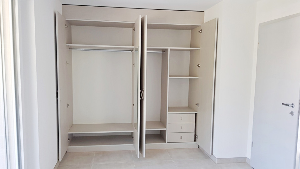 Il est composé d'un hall d'entrée, d'une pièce de séjour / salle à manger lumineuse, d'une cuisine ouverte agencée, d'une chambre, d'une salle de bain avec douche italienne et wc, ainsi que d'une grande terrasse. Le logement est doté d'innombrables rangements.