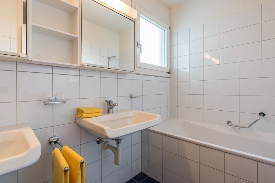 • Badezimmer mit WC, zwei Lavabos, Spiegelschrank und Badewanne