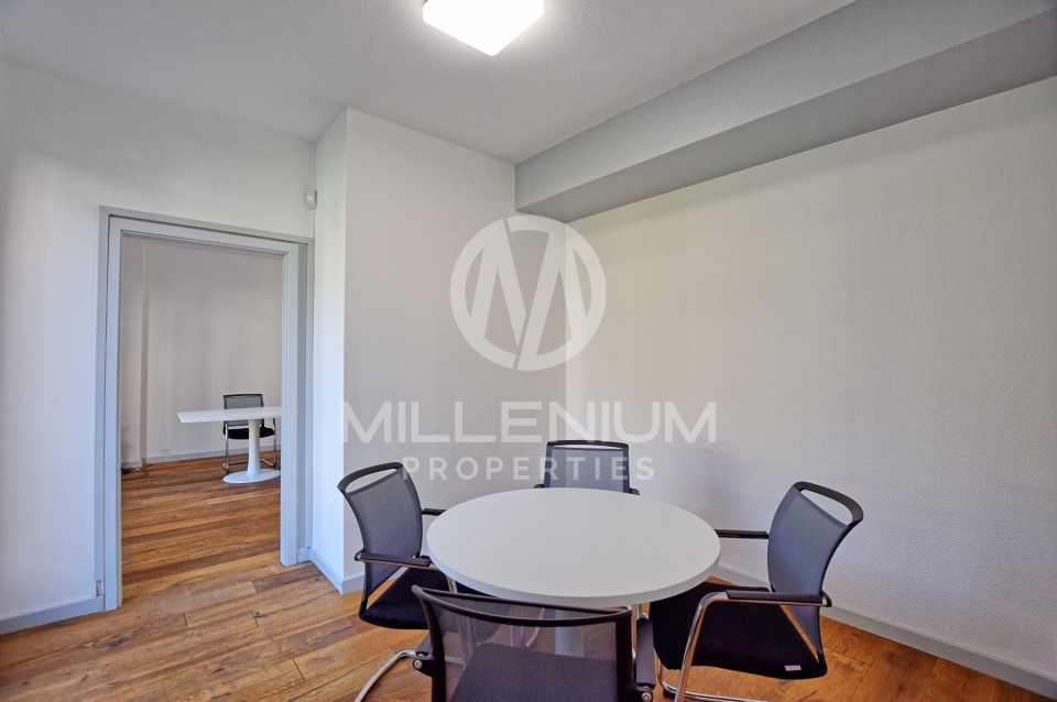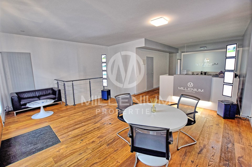 Elle est composée d'une réception avec comptoir d'accueil, d'une salle de réunion à l'arrière, d'un bureau independant. d'un sous-sol.
