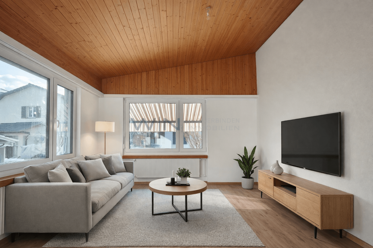 Der Wohnbereich mit offener Decke sorgt für ein angenehmes Raumgefühl und verleiht dem Haus Weite und Leichtigkeit. Alle Zimmer sind geräumig, hell und vielseitig nutzbar, geeignet für Kinder, Homeoffice oder Gäste. Süd-Terrasse und Garten erweitern den Wohnraum angenehm und bieten Platz für Erholung und Bewegung.