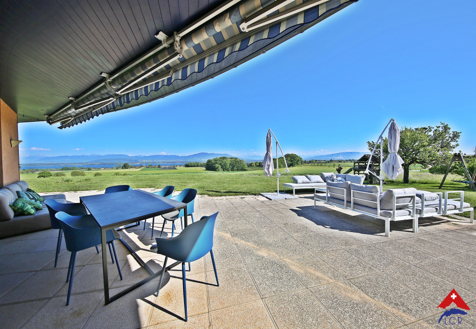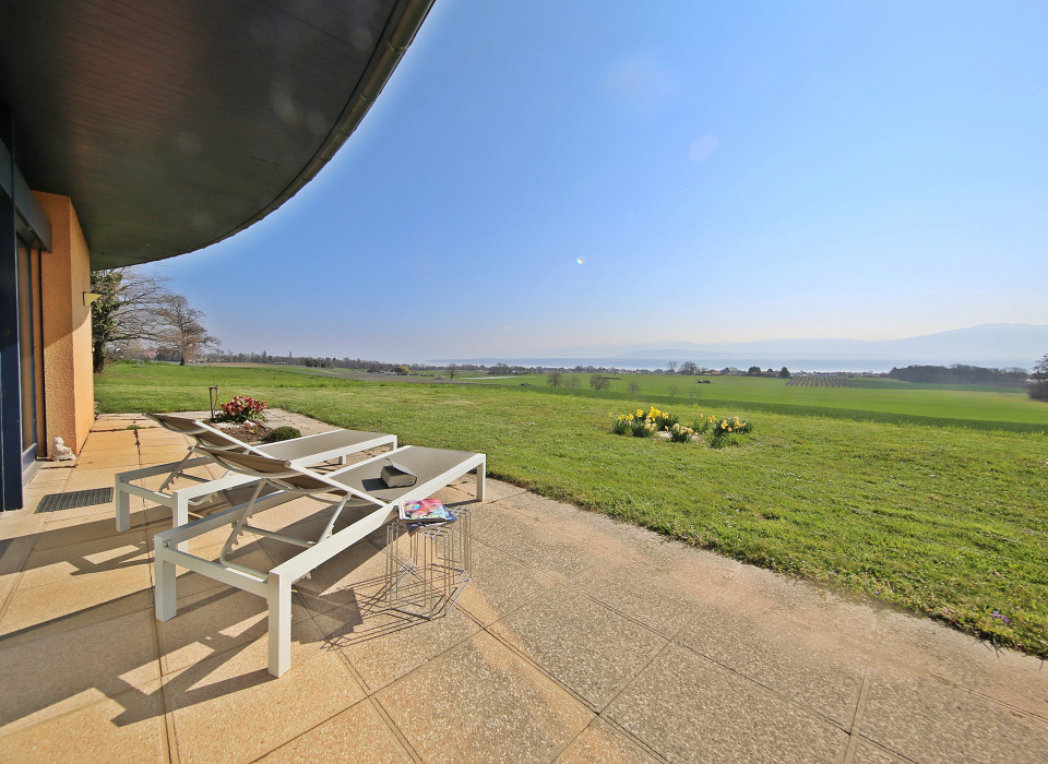 Aucun vis-à-vis, au calme avec vue dégagée sur le lac et les Alpes.
